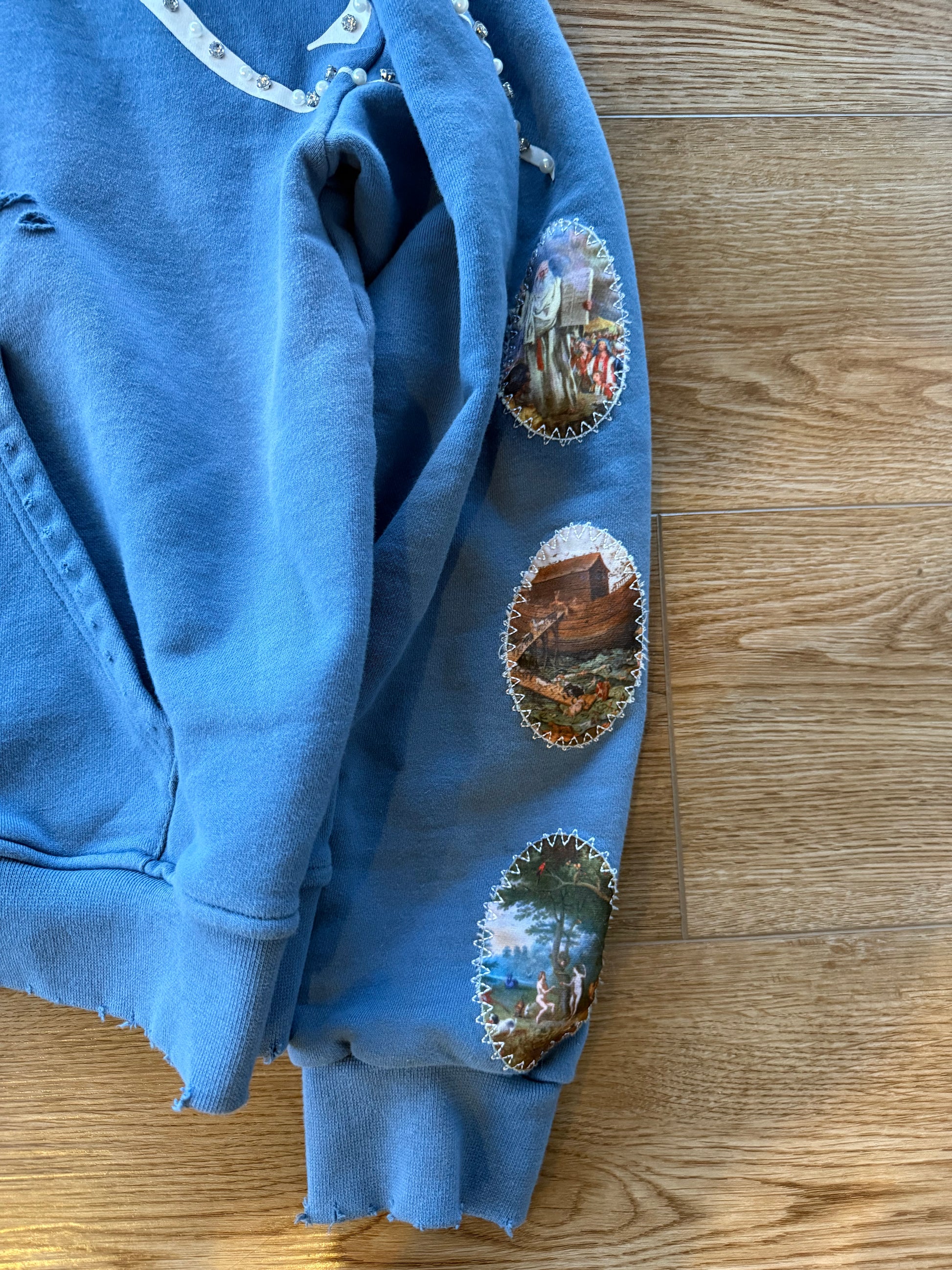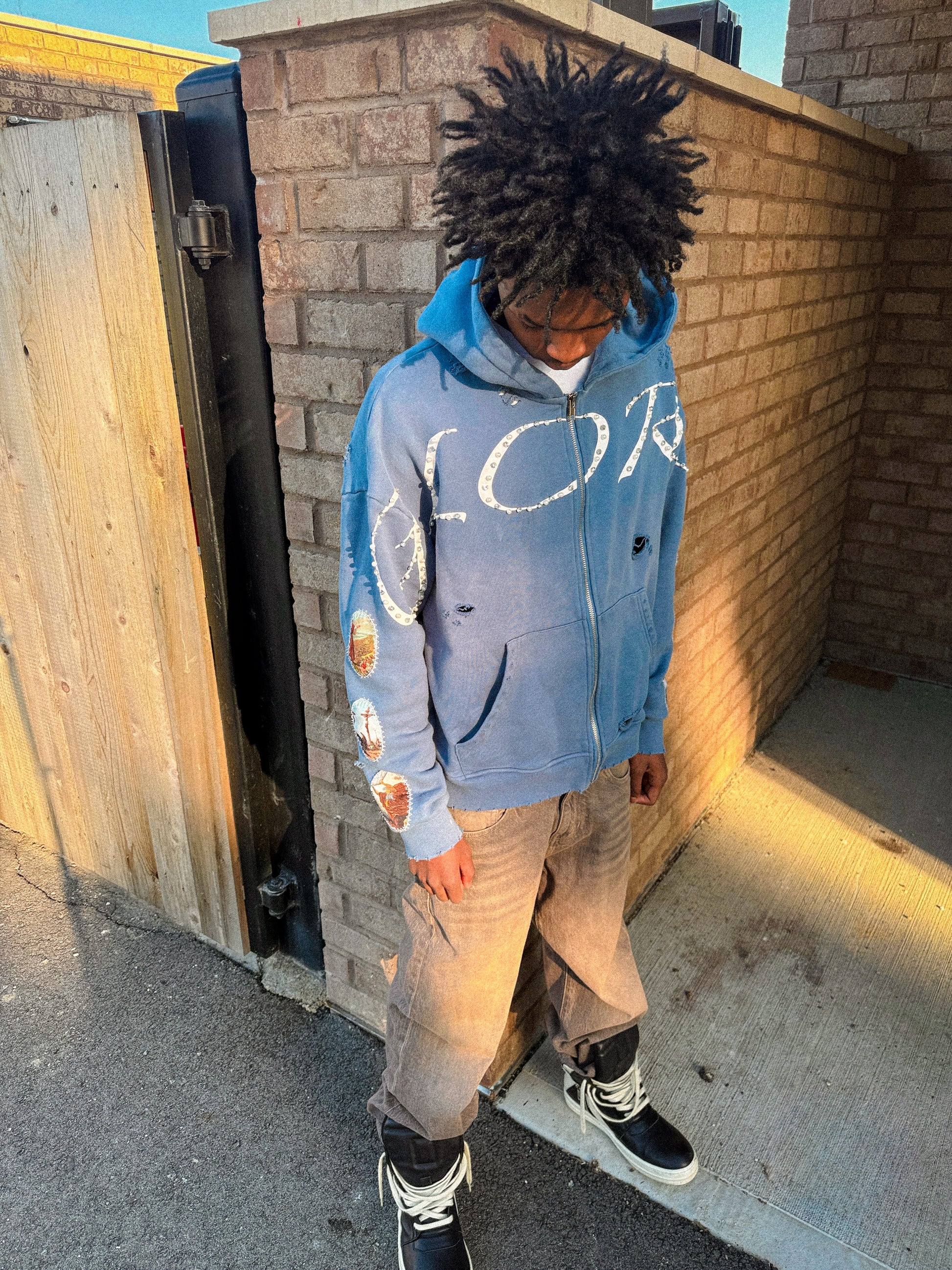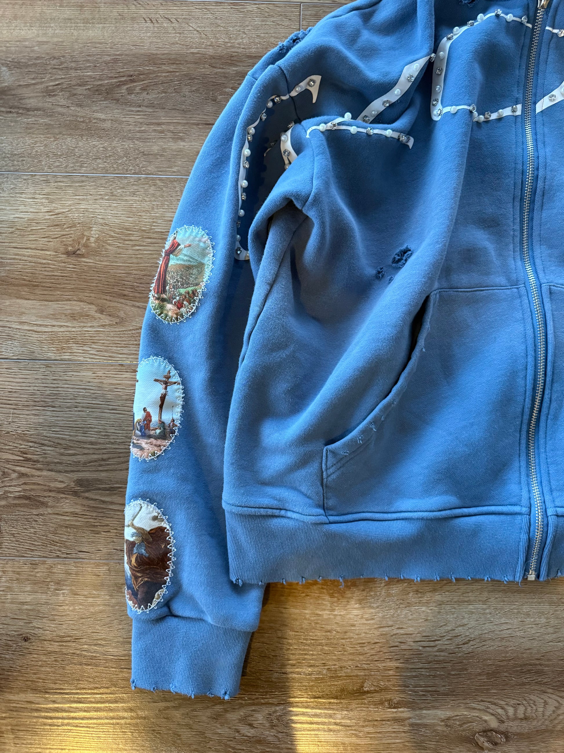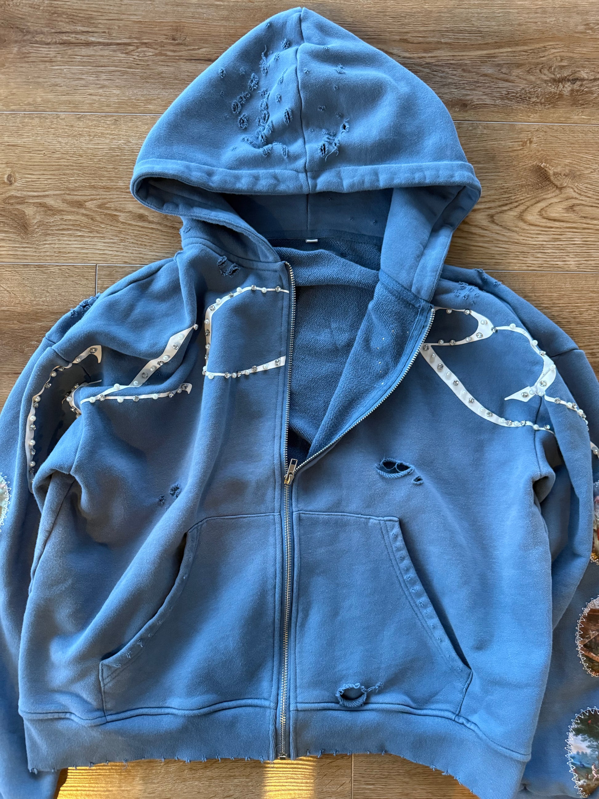 Our "WAYMAKER" zipup is biblically inspired, embodying the discipline of walking a divinely guided path. Intentional distressing mirrors refinement through trial, while sacred sleeve imagery signifies revelation and moral direction. Pearls represent wisdom formed under pressure, and gemstones signify divine promise and strength made not for perfection, but for enlightened purpose.